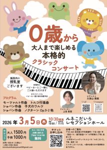 0歳から大人まで楽しめる本格的クラシックコンサート 公演日:2026年3月5日(木)10:00開場 10:30開演 11:15終演予定 会場:ルネこだいら レセプションホール ショパン作曲 子犬のワルツ ショパン作曲 ノクターンOp.9−2 モーツァルト作曲 トルコ行進曲 他 お申し込みはこちらから https://livepocket.jp/e/0cdou back next Concert List
